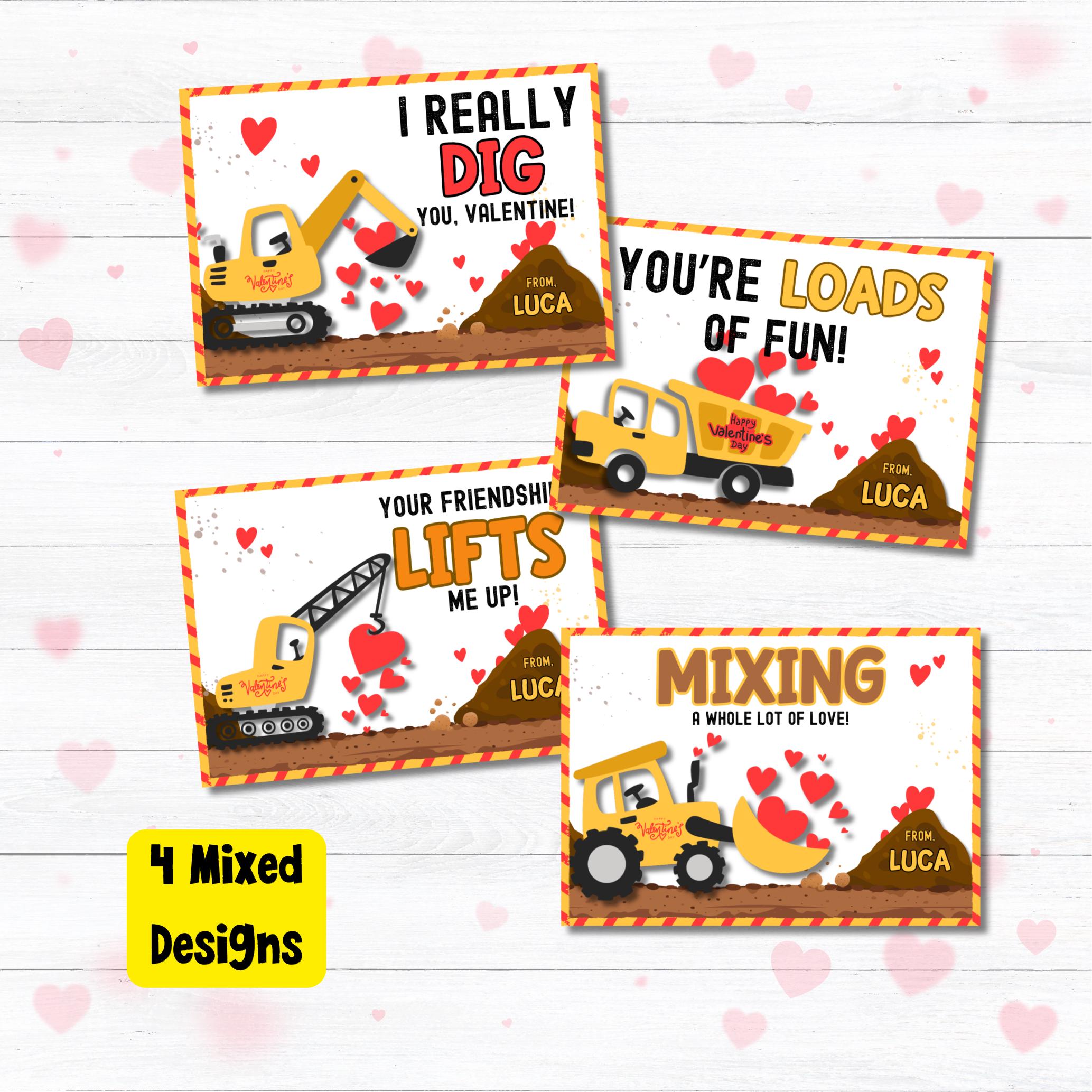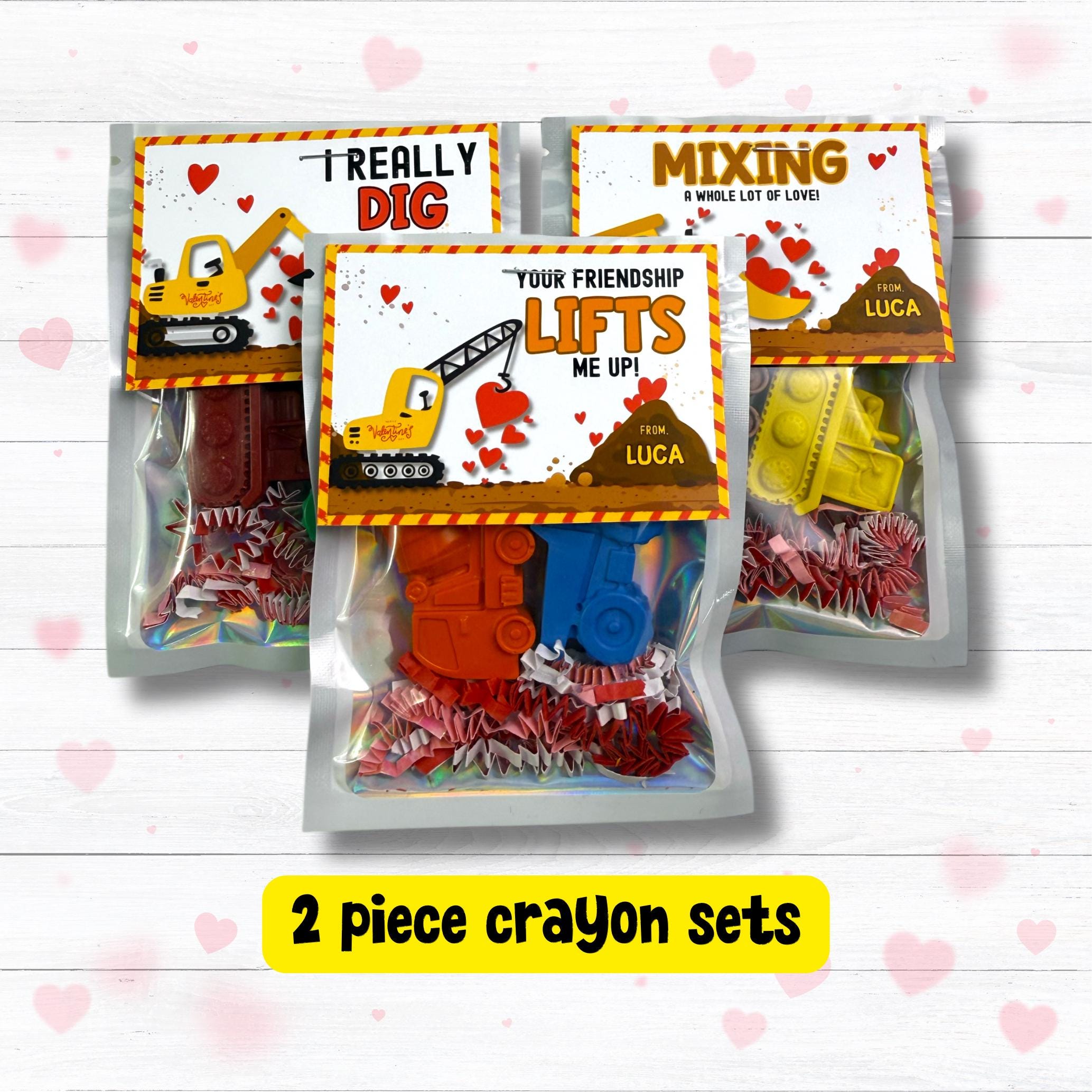 These adorable truck valentines are perfect for kids classroom valentines, preschool parties, and boys Valentine’s Day gifts. Each set includes a personalized card with your child’s name and your choice of one or two construction-themed crayons — ready to hand out to classmates!