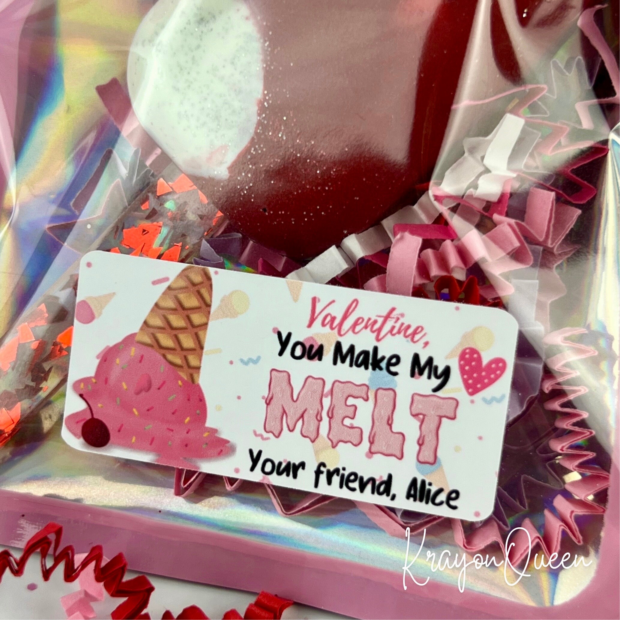 These Custom Valentines come beautifully packaged in vibrant Color Zip Bags, adding a touch of excitement to Valentine Exchanges. What makes them even more special is the personalized touch – every bag bears the giver's name and a heartfelt message: "Valentine, you make my heart melt." Each bag features an adorable ice cream shape label, making these Ice Cream Valentines truly unique.