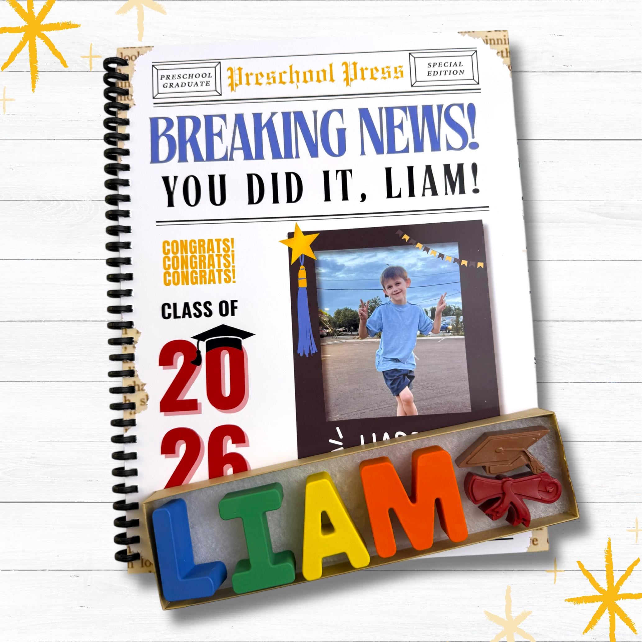 Elevate the excitement of kindergarten graduation with our personalized coloring and activity book! Featuring 30 (printed front and back for total of 60) engaging pages and activities, this keepsake offers endless creative fun. Each set includes custom name crayons with two graduation-themed crayons, making it the perfect gift to celebrate this special milestone. Spark imagination and cherish memories with this unique and thoughtful keepsake for your little graduate.