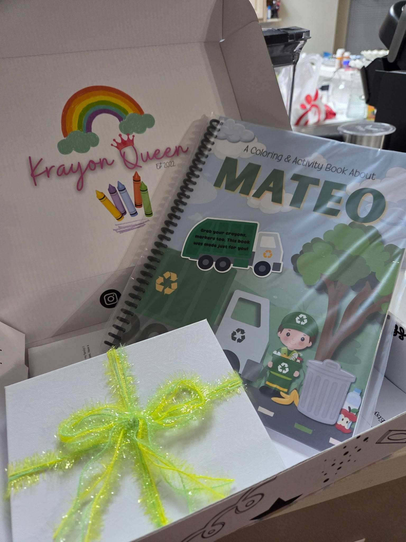 * Each book has 50 (25 printed front and back) pages of fun filled activity and coloring! Each book is paired with custom name crayons and a garbage truck crayon in a gift box.