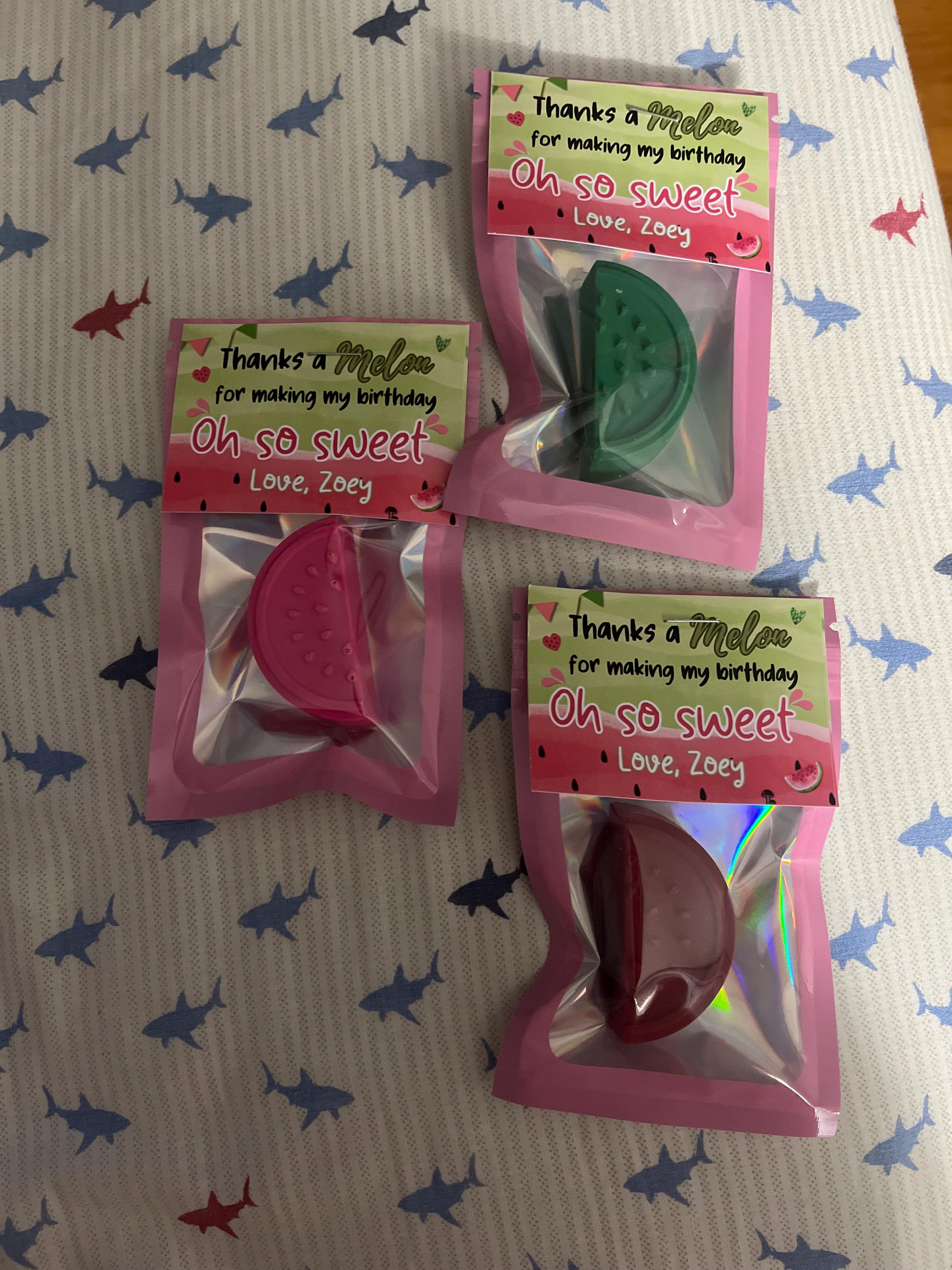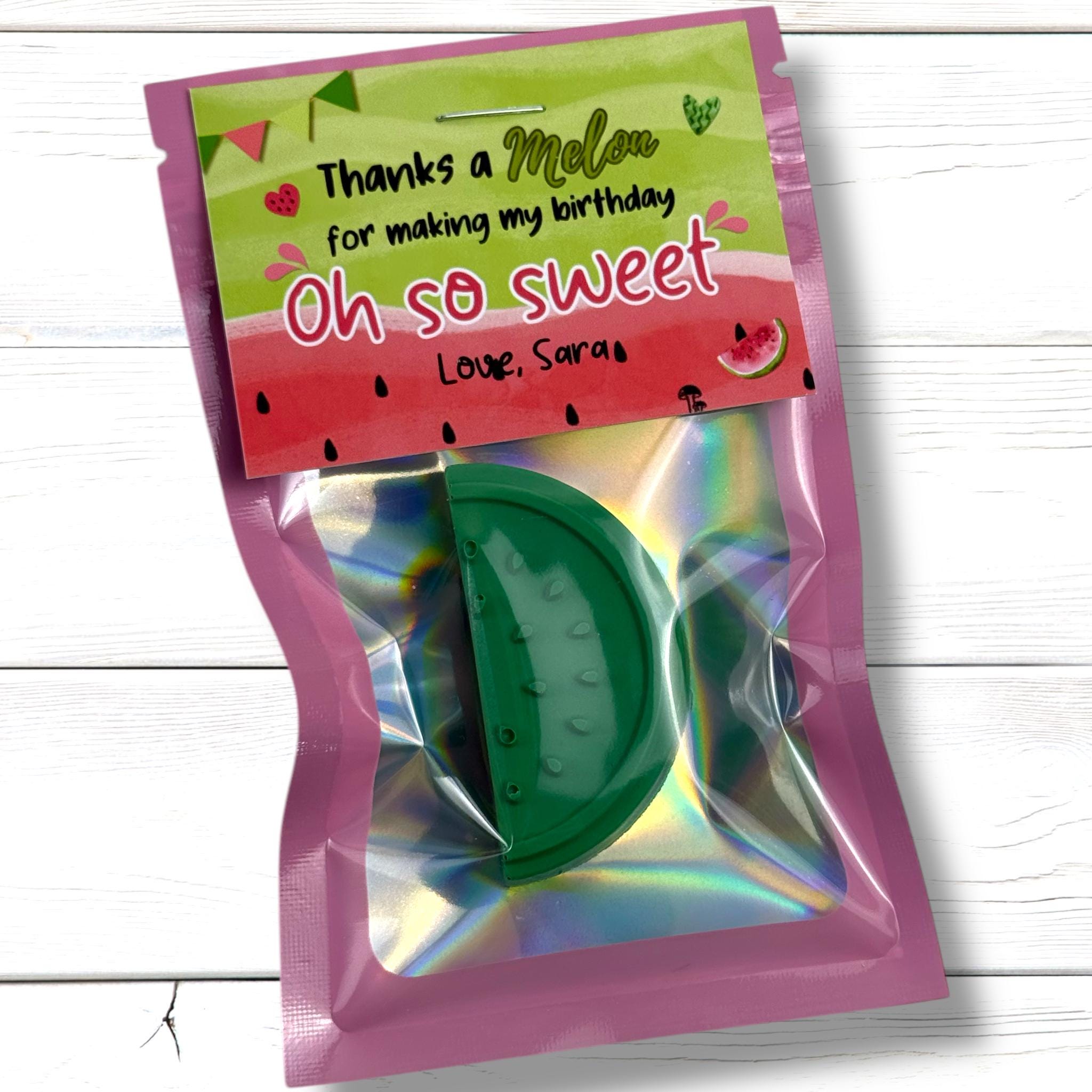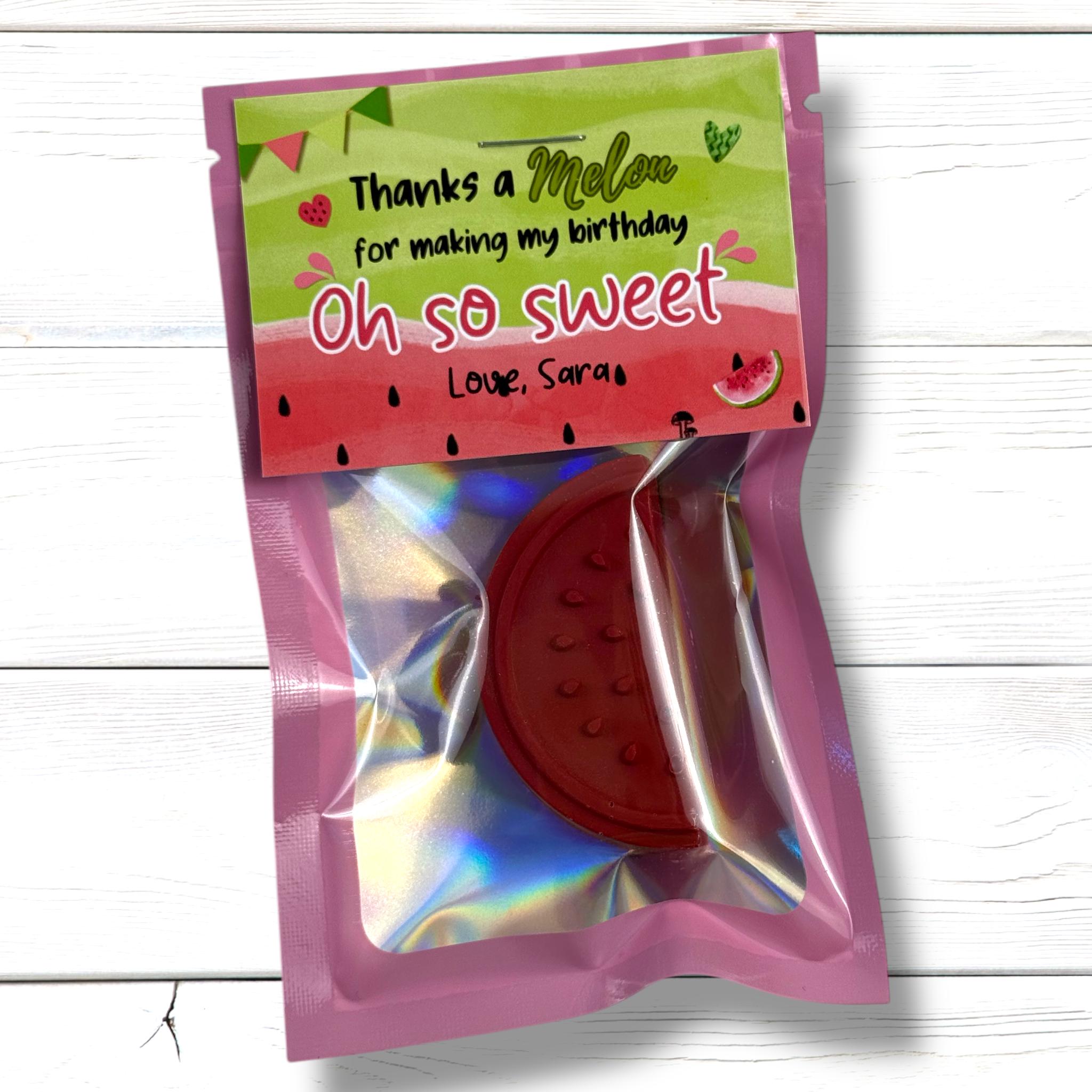 You will receive a watermelon shaped custom crayon inside a pink reusable bag with a personalized tag attached to the bag.