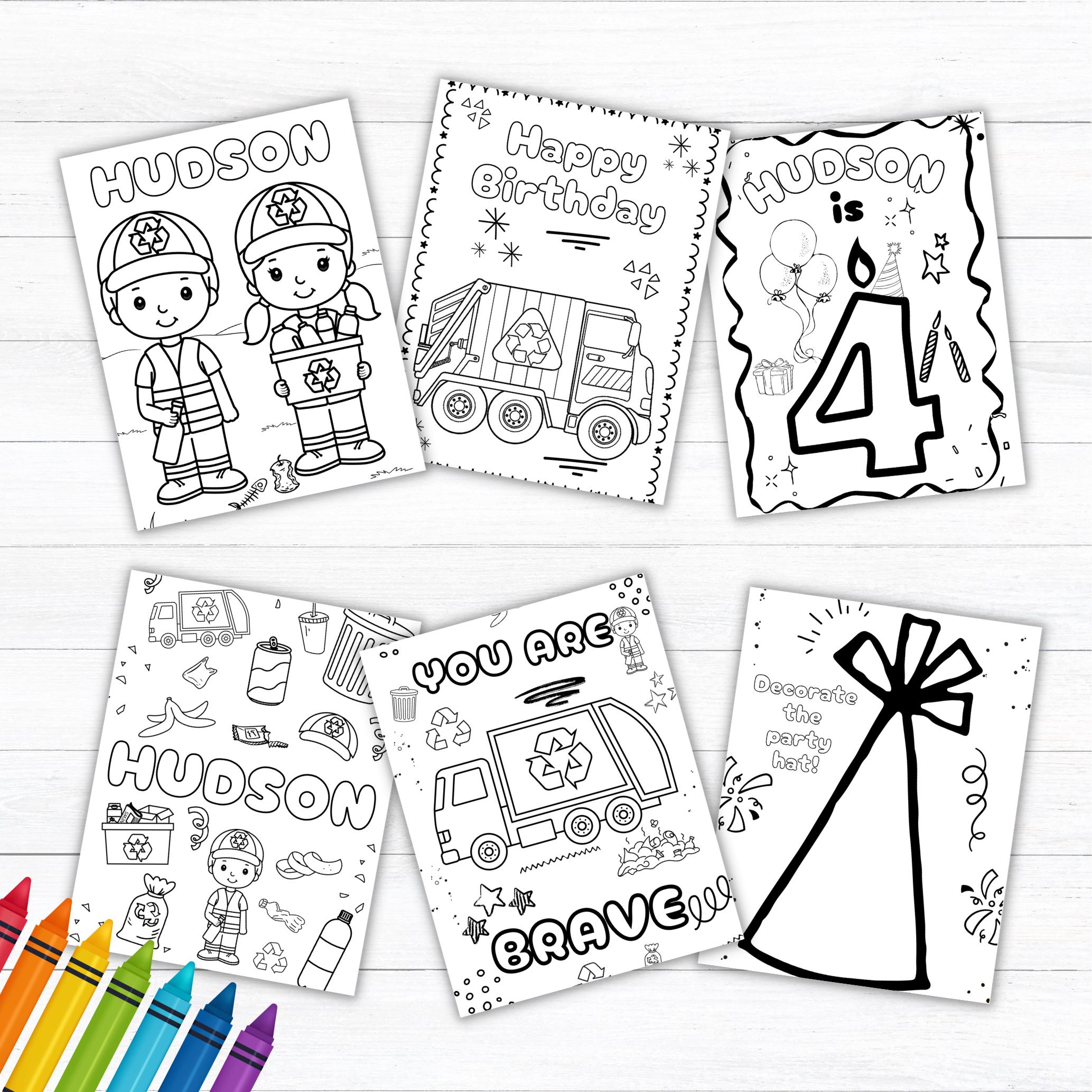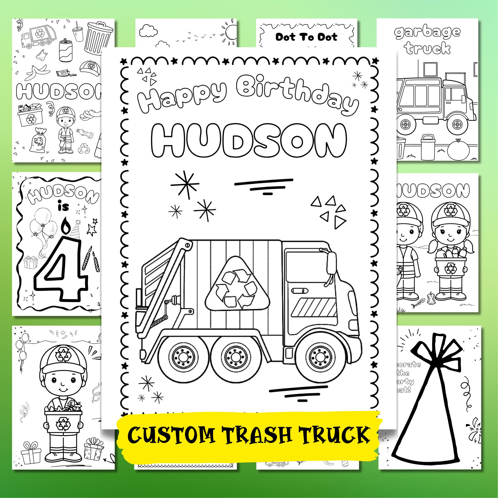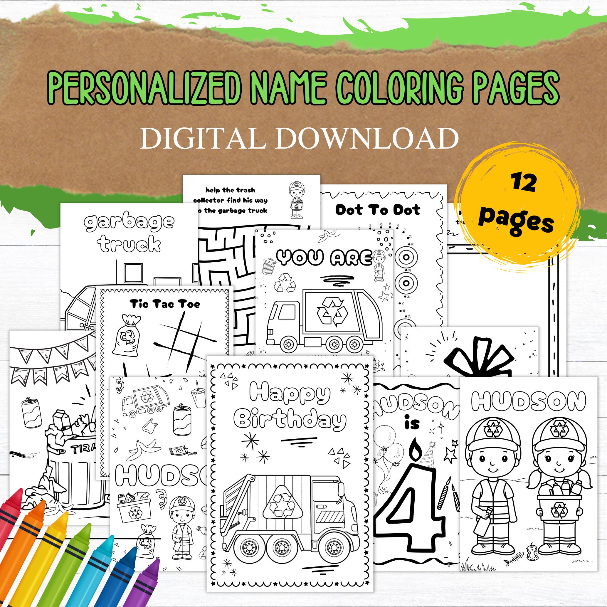 This listing is for a digital download, print-ready set of 12 personalized birthday garbage truck coloring pages. The following files will be included with your purchase: