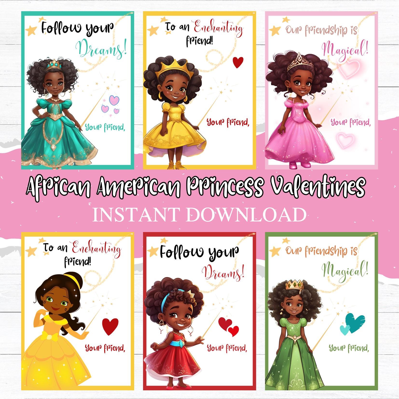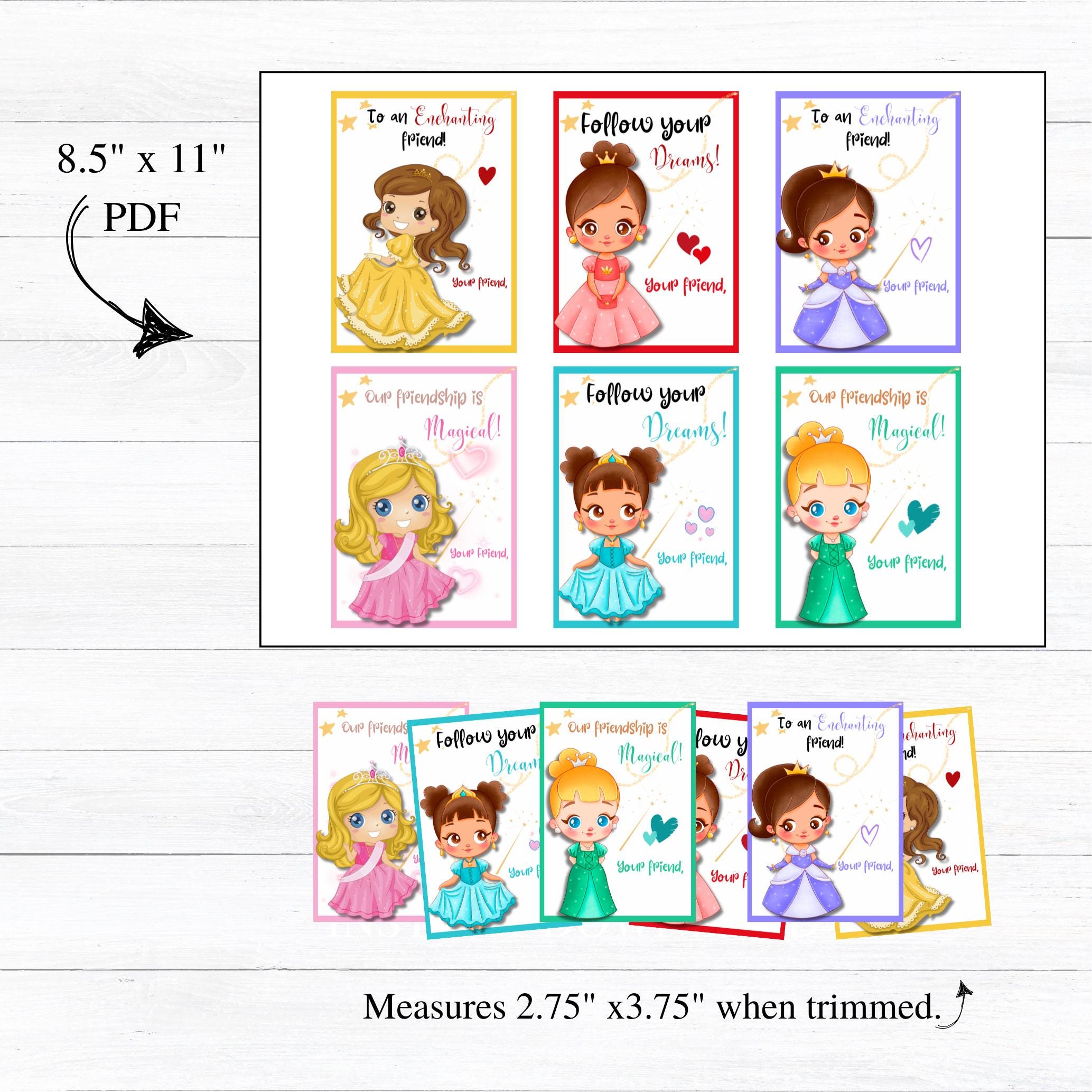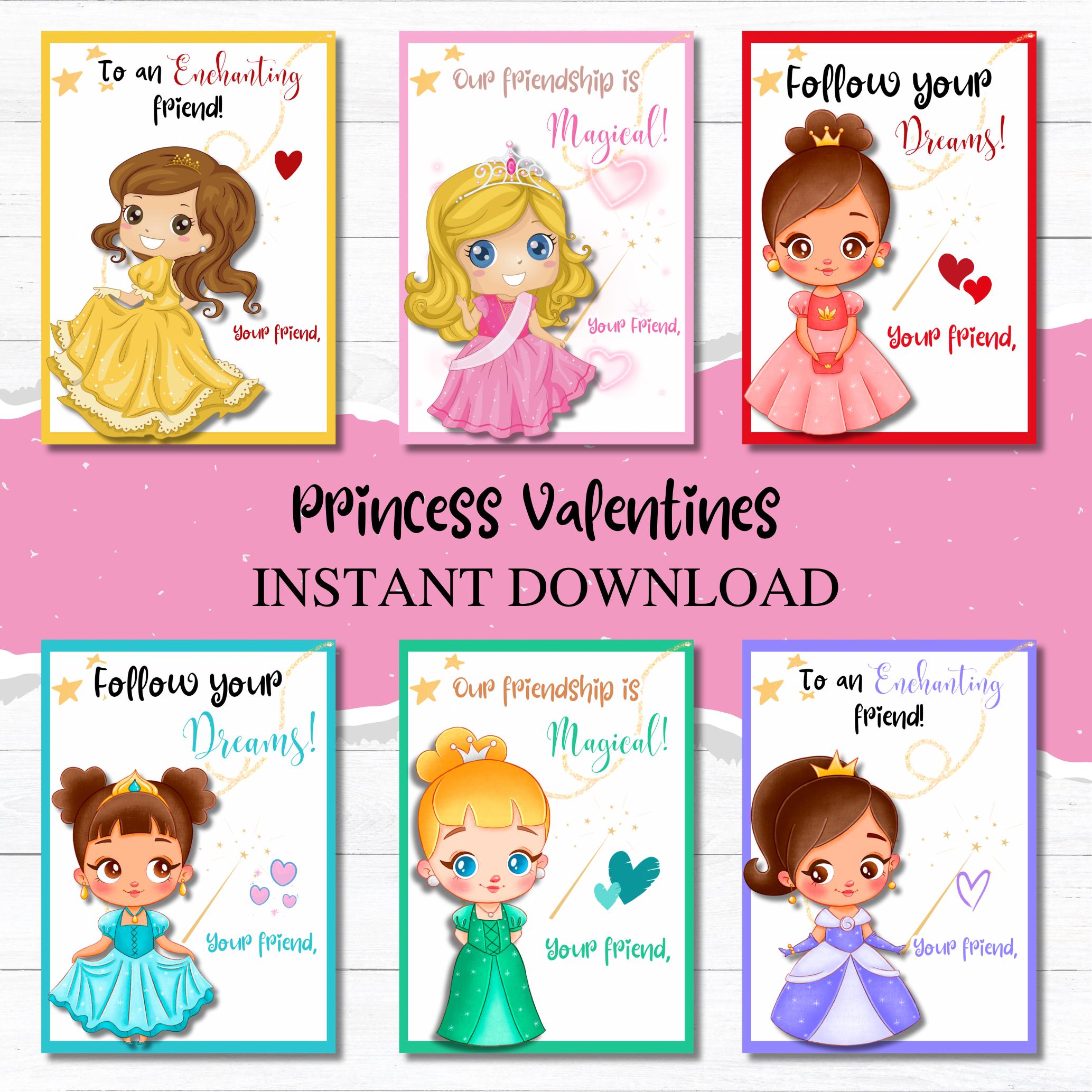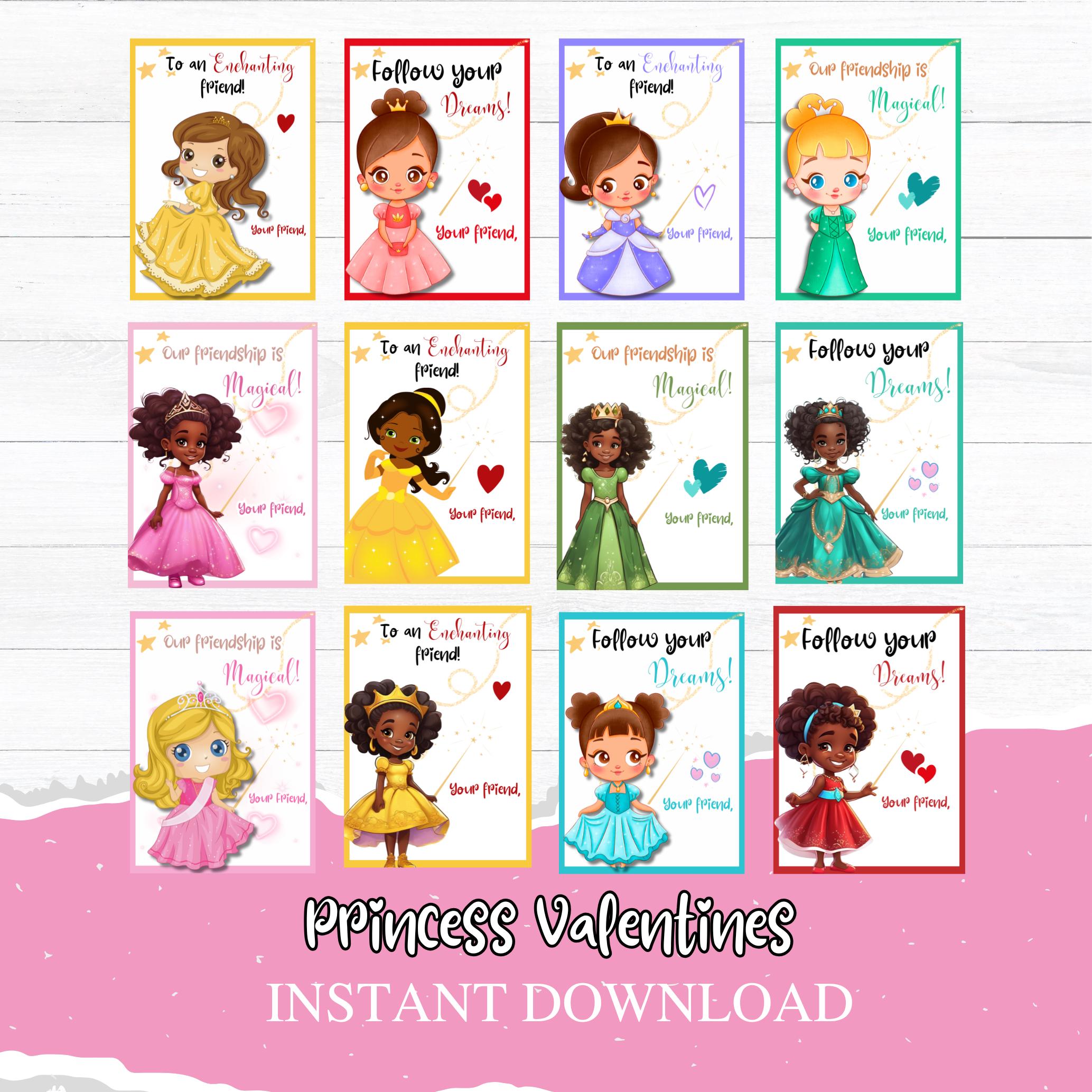 This listing is for an instant download, print-ready set of 12 princess themed Valentine's Day cards. The following files will be included with your purchase: