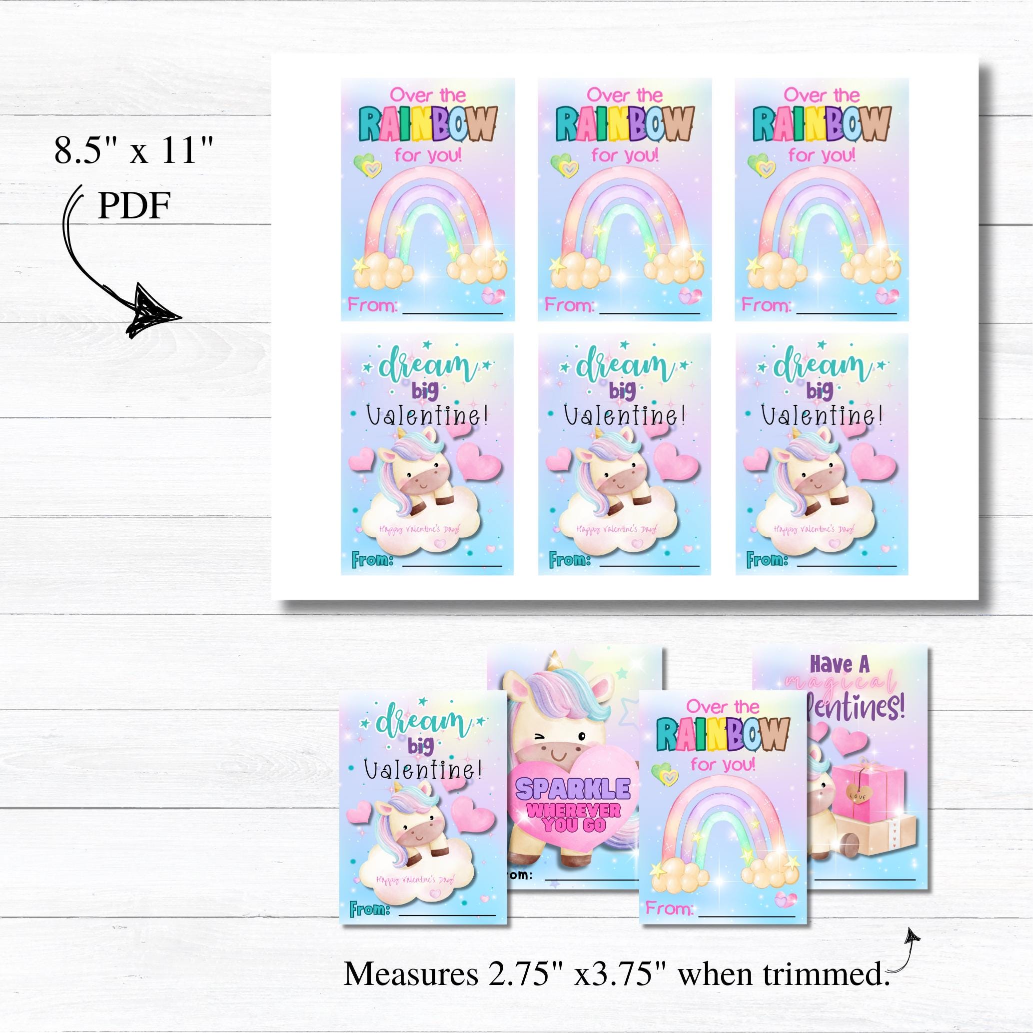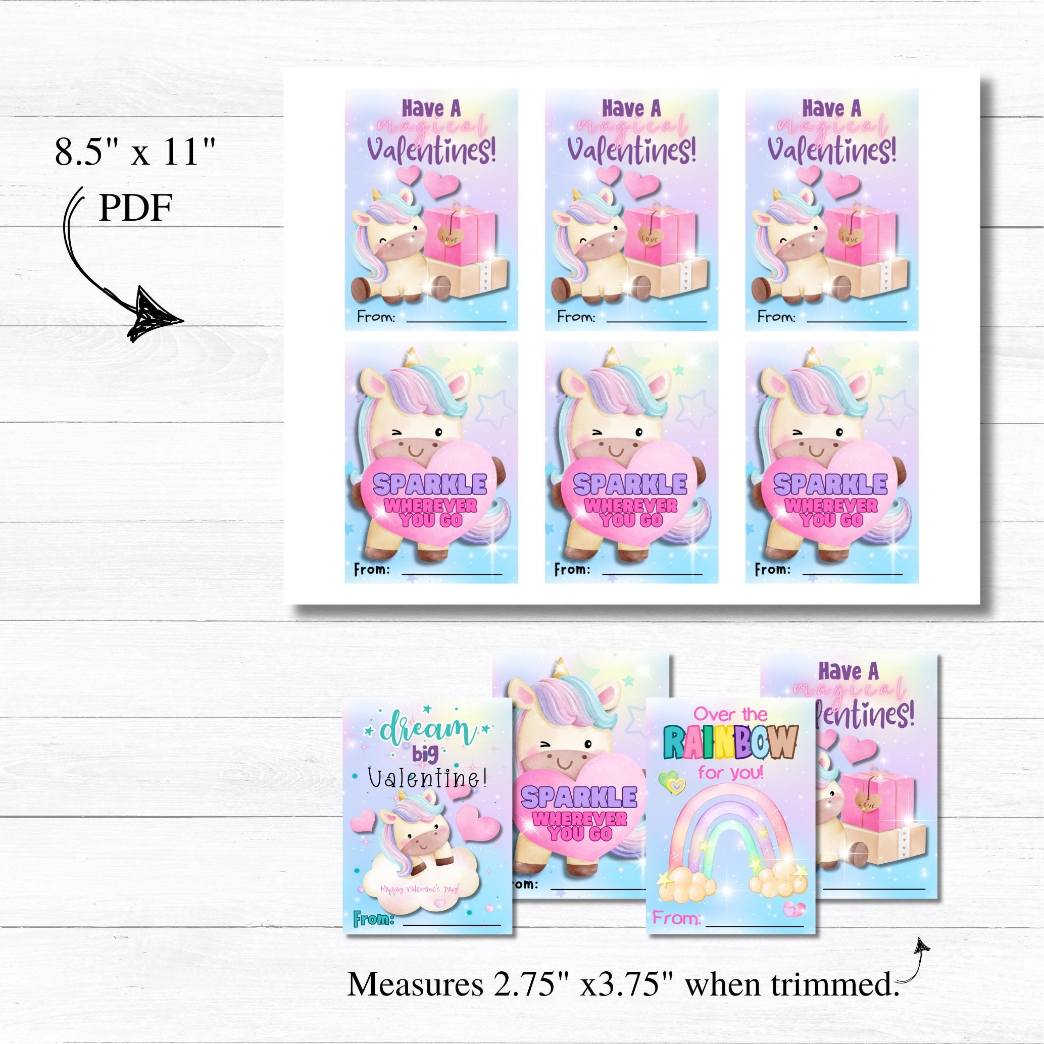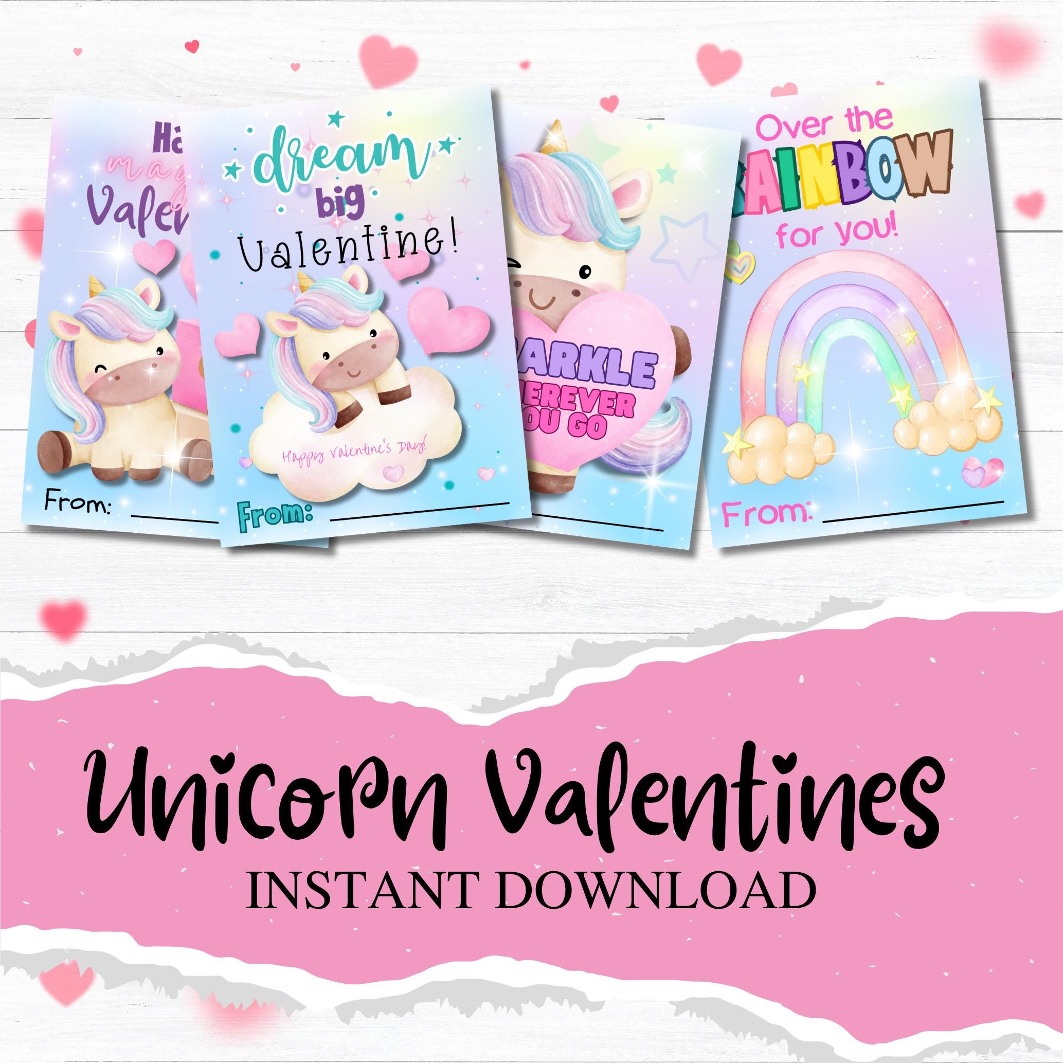This listing is for an instant download, print-ready set of 4 unicorn Valentine's Day cards. The following files will be included with your purchase: