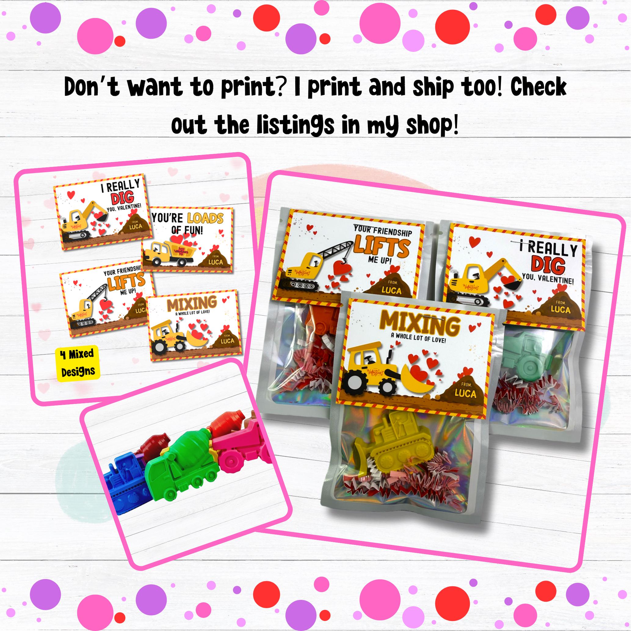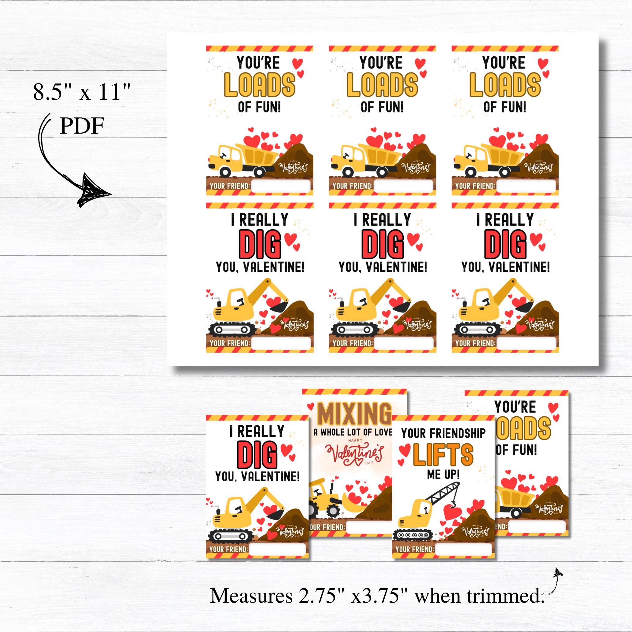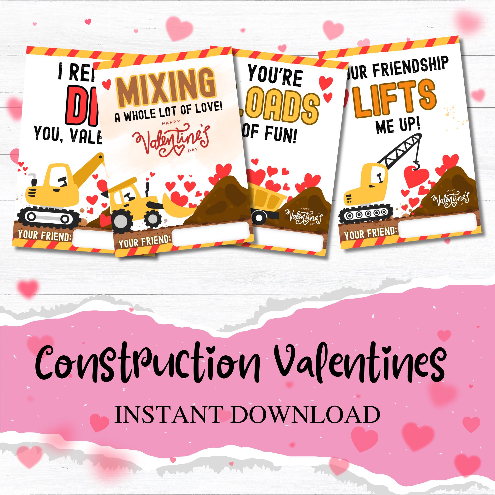 This listing is for an instant download, print-ready set of 4 construction truck Valentine's Day cards. The following files will be included with your purchase: