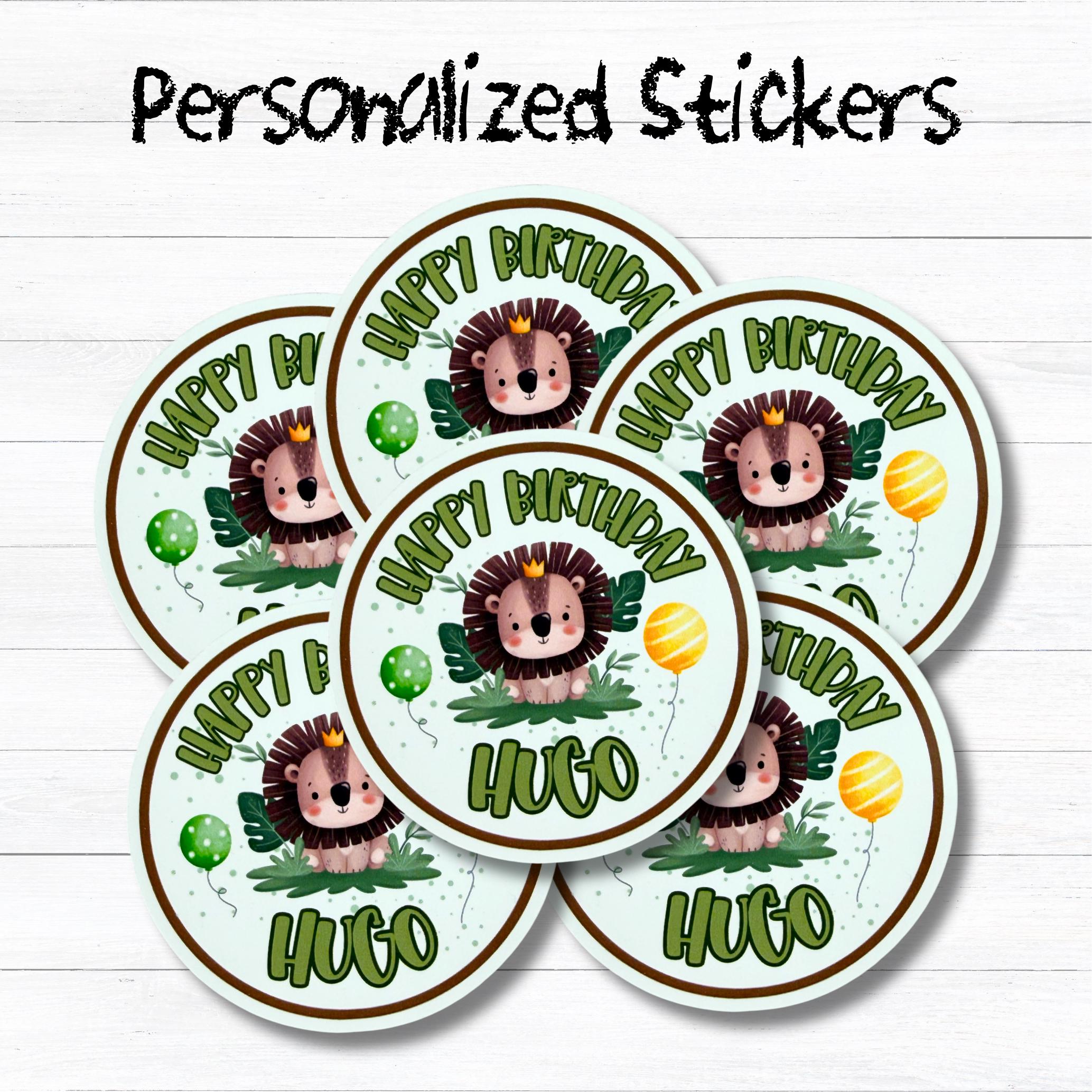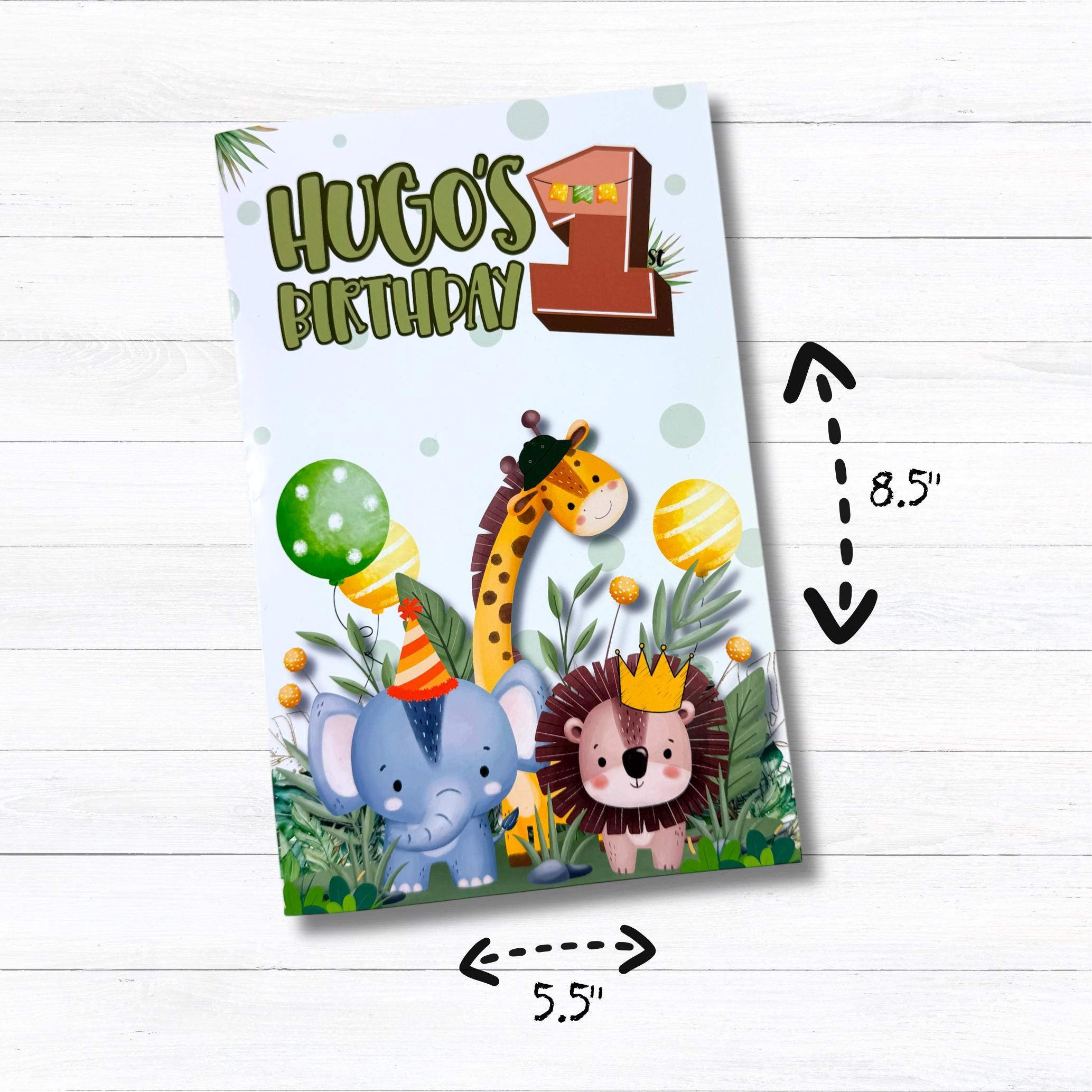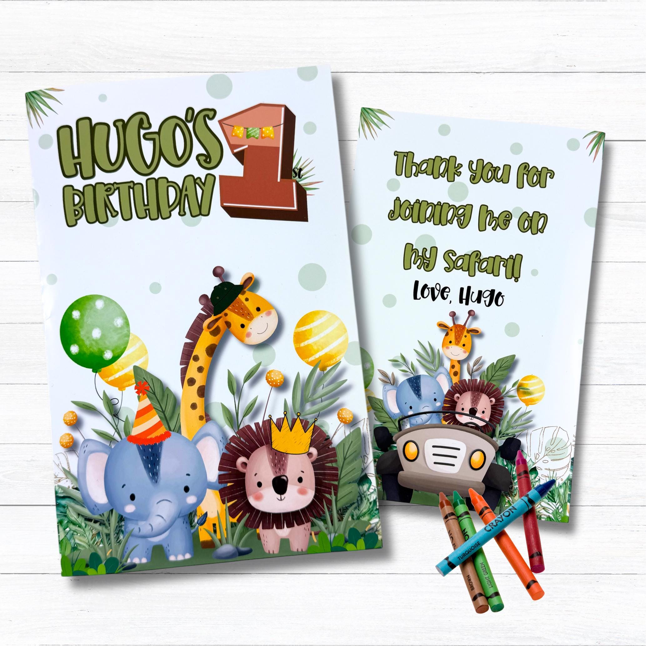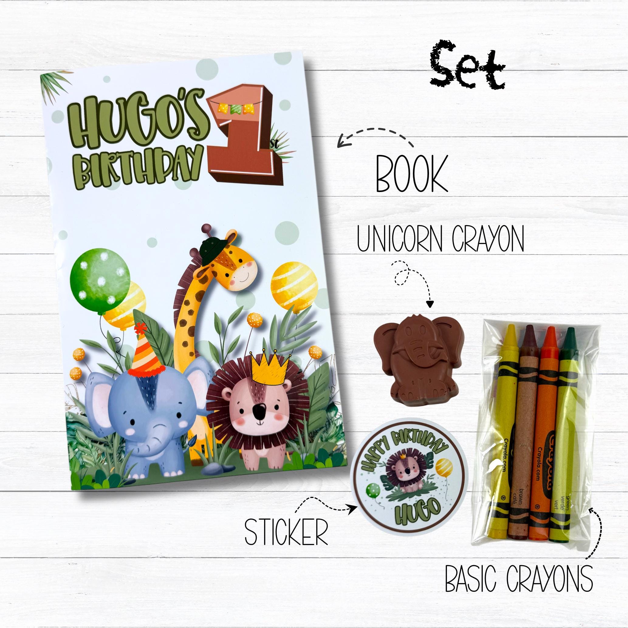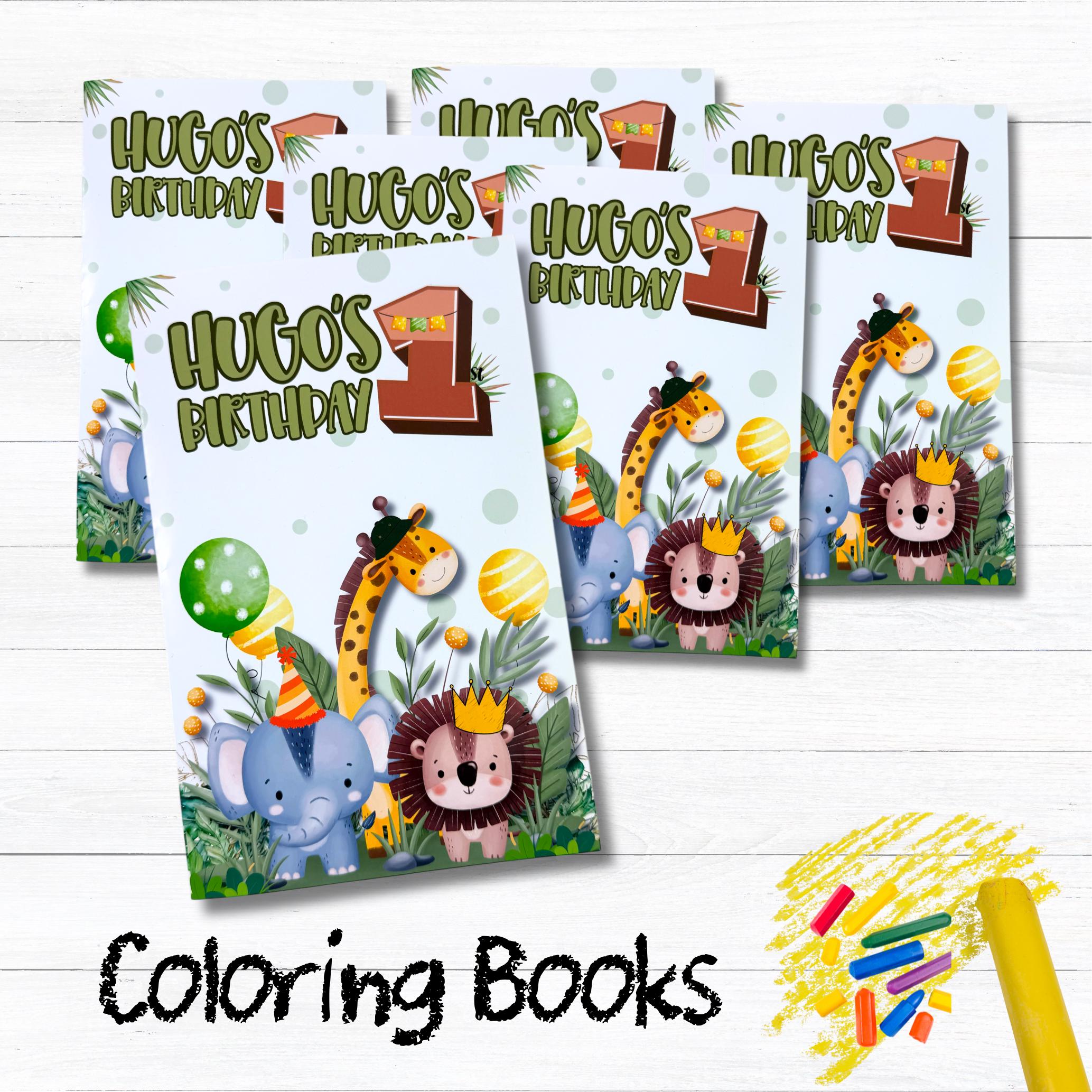 This safari-themed coloring book set includes a personalized coloring book, themed stickers, a custom name crayon, and classic crayons β making it the perfect activity for jungle and safari birthday parties.