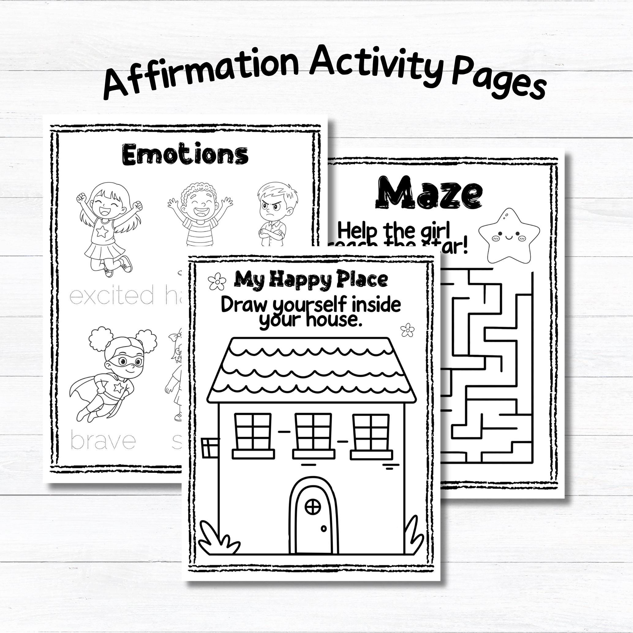 This isn’t just a coloring book — it’s a learning workbook that helps children build confidence, emotional awareness, and early education skills through positive affirmations and simple activities.