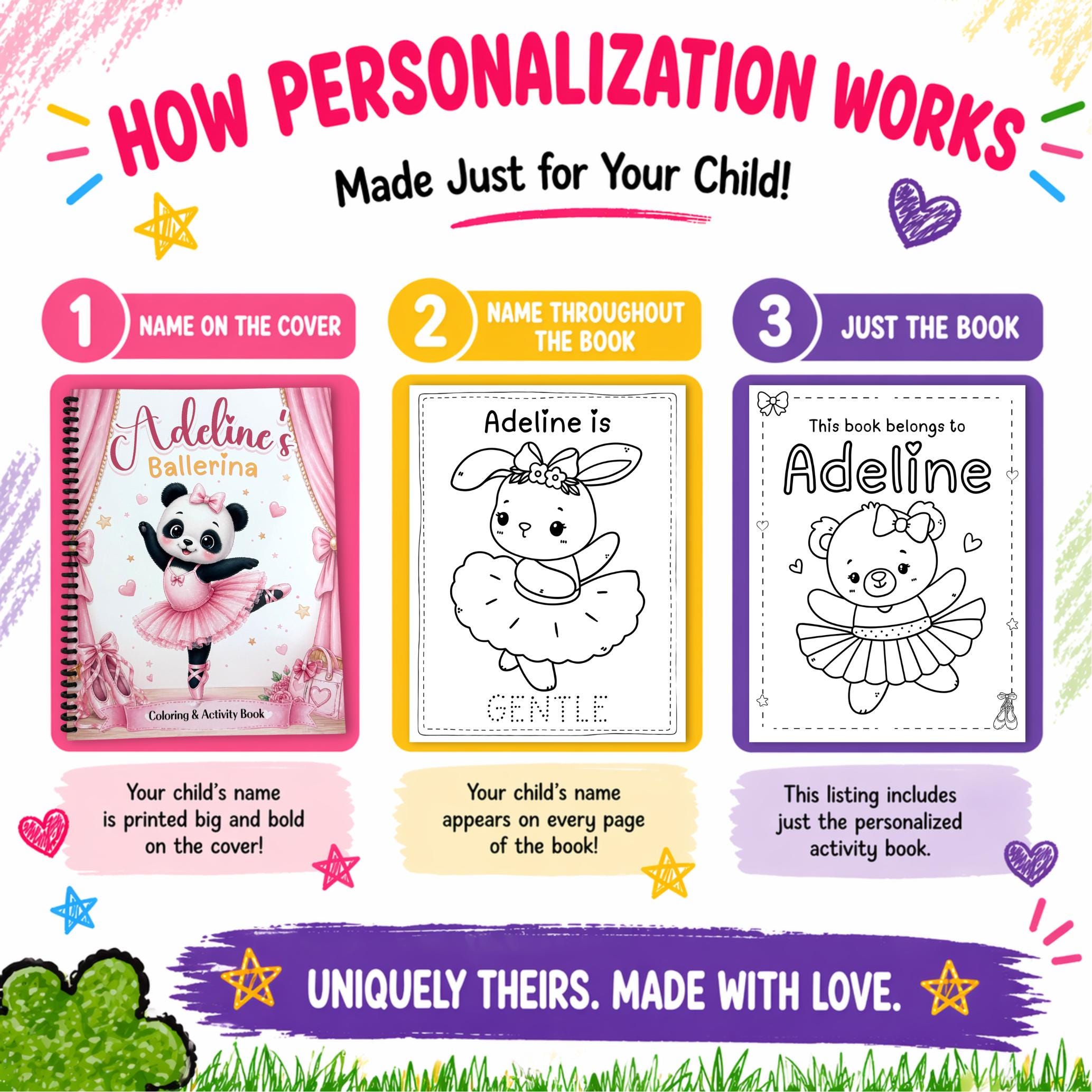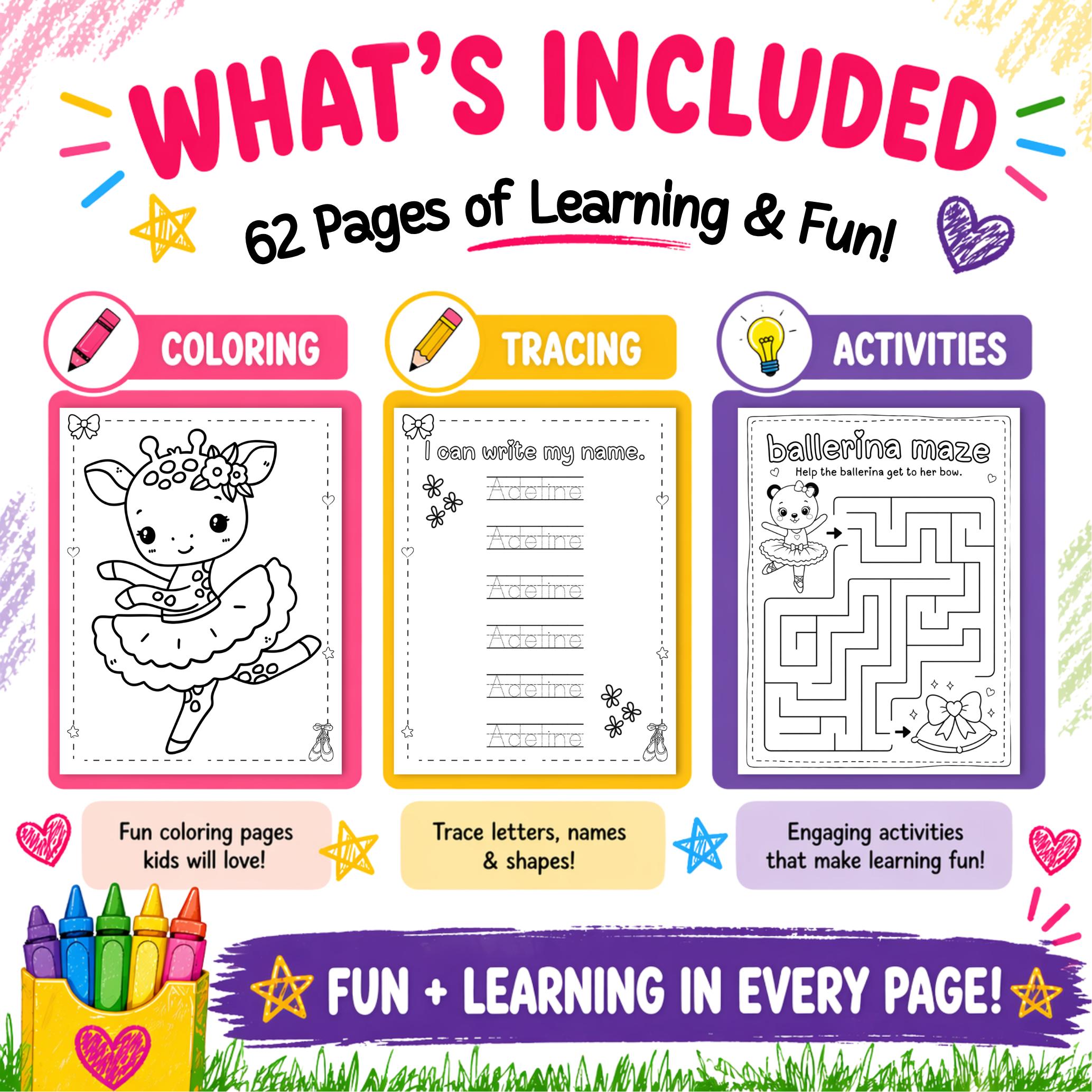 This personalized ballerina activity book is designed to help little learners build confidence while they play, trace, and create 💛