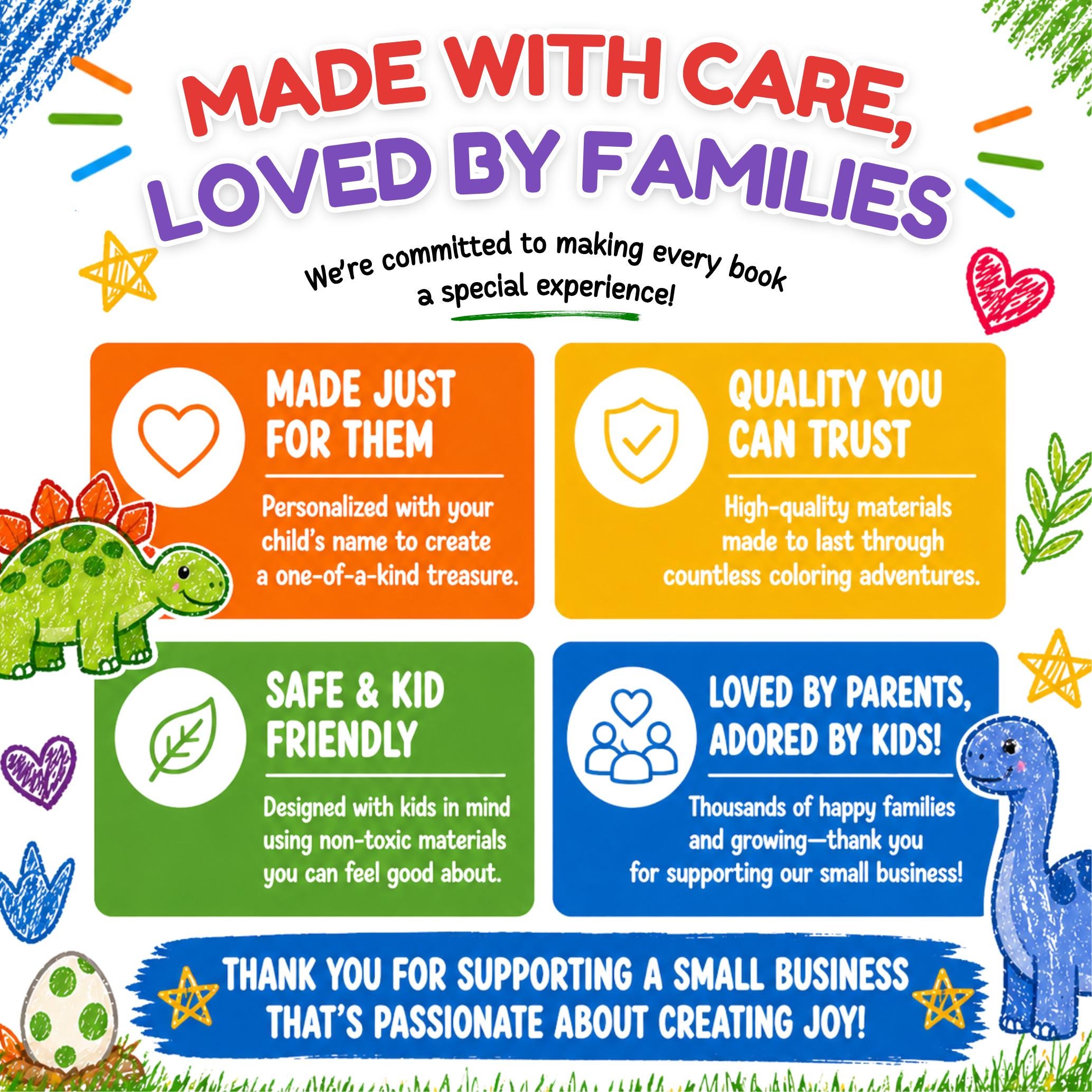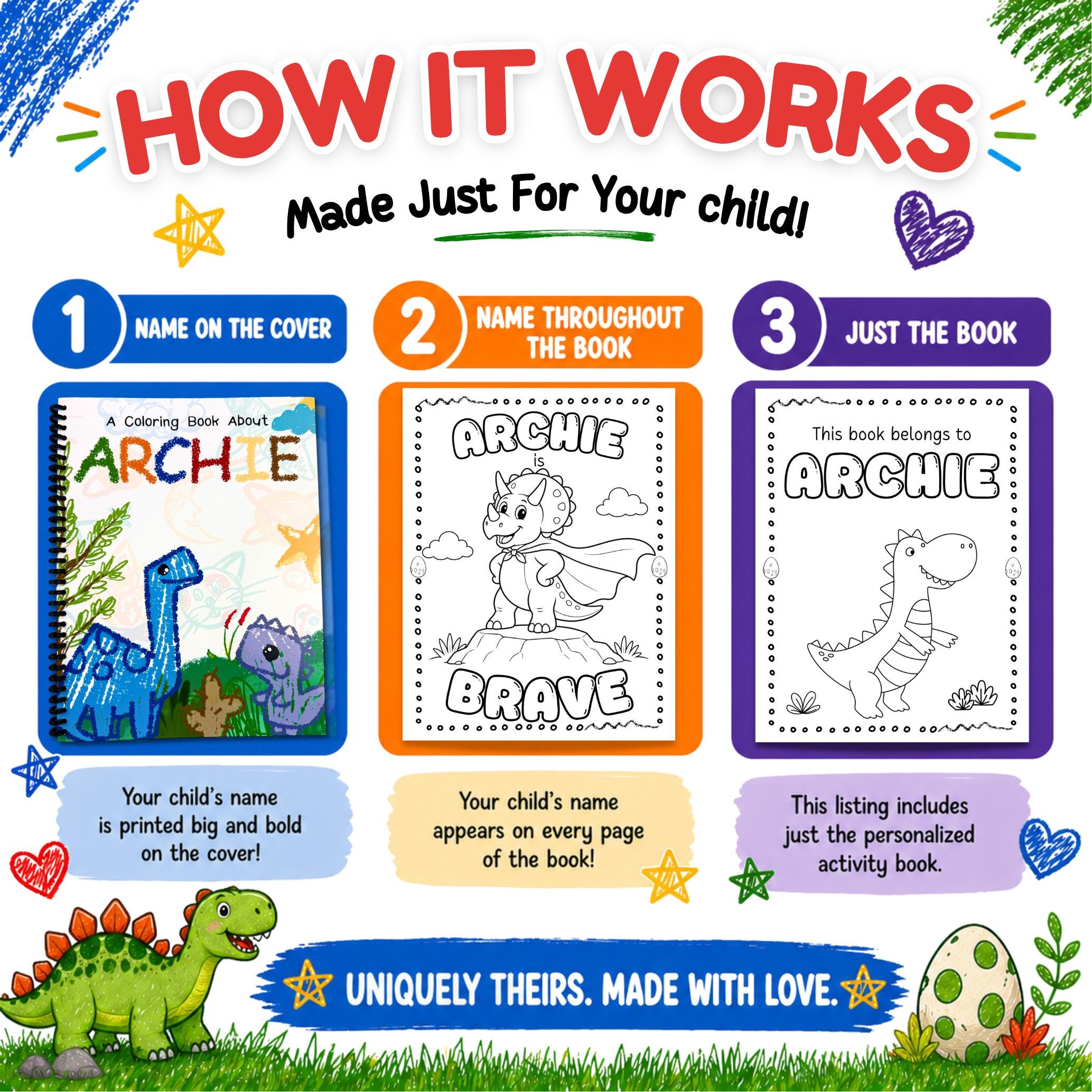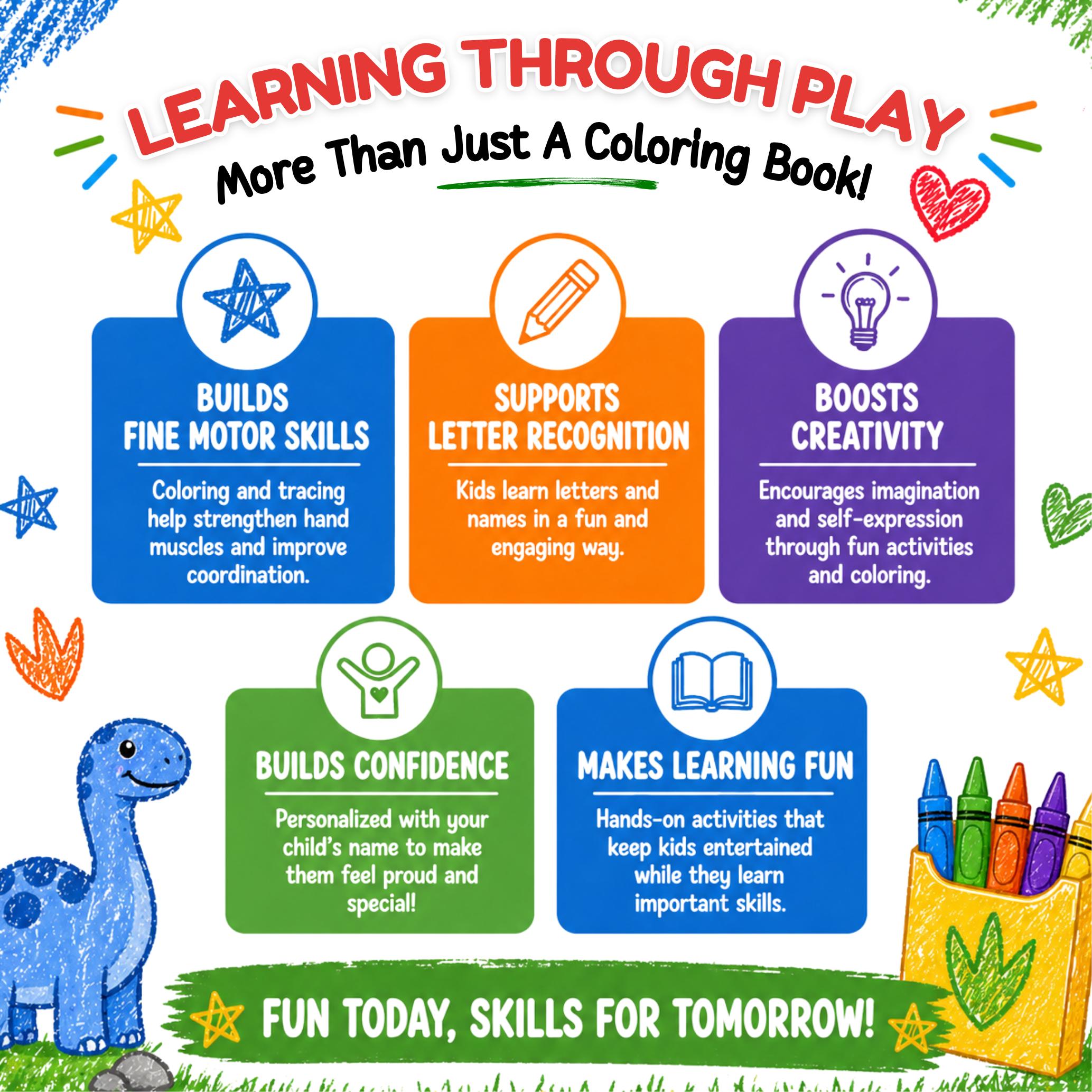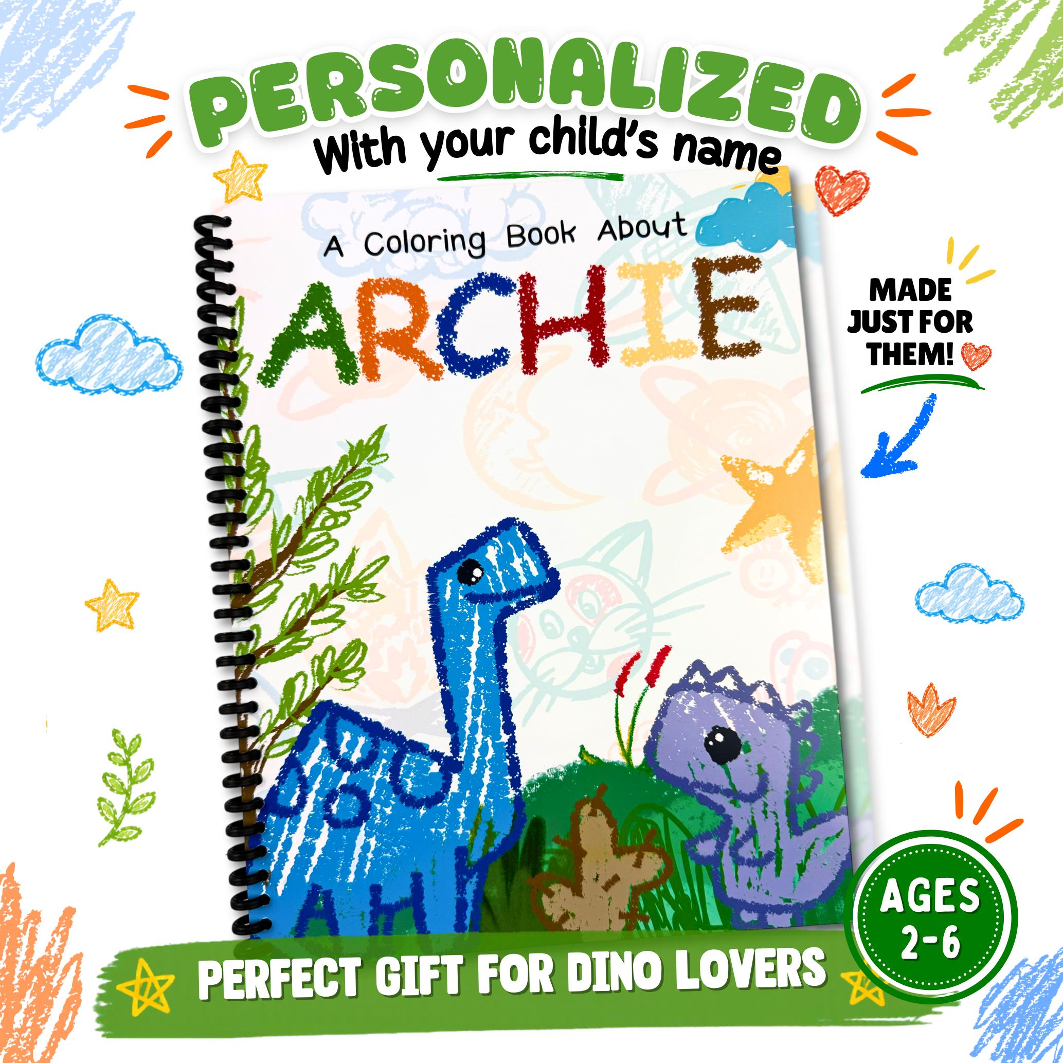 Make learning fun with a custom dinosaur coloring book designed just for your child! Each book is personalized with their name and filled with engaging activities that build early learning skills in a fun, creative way.